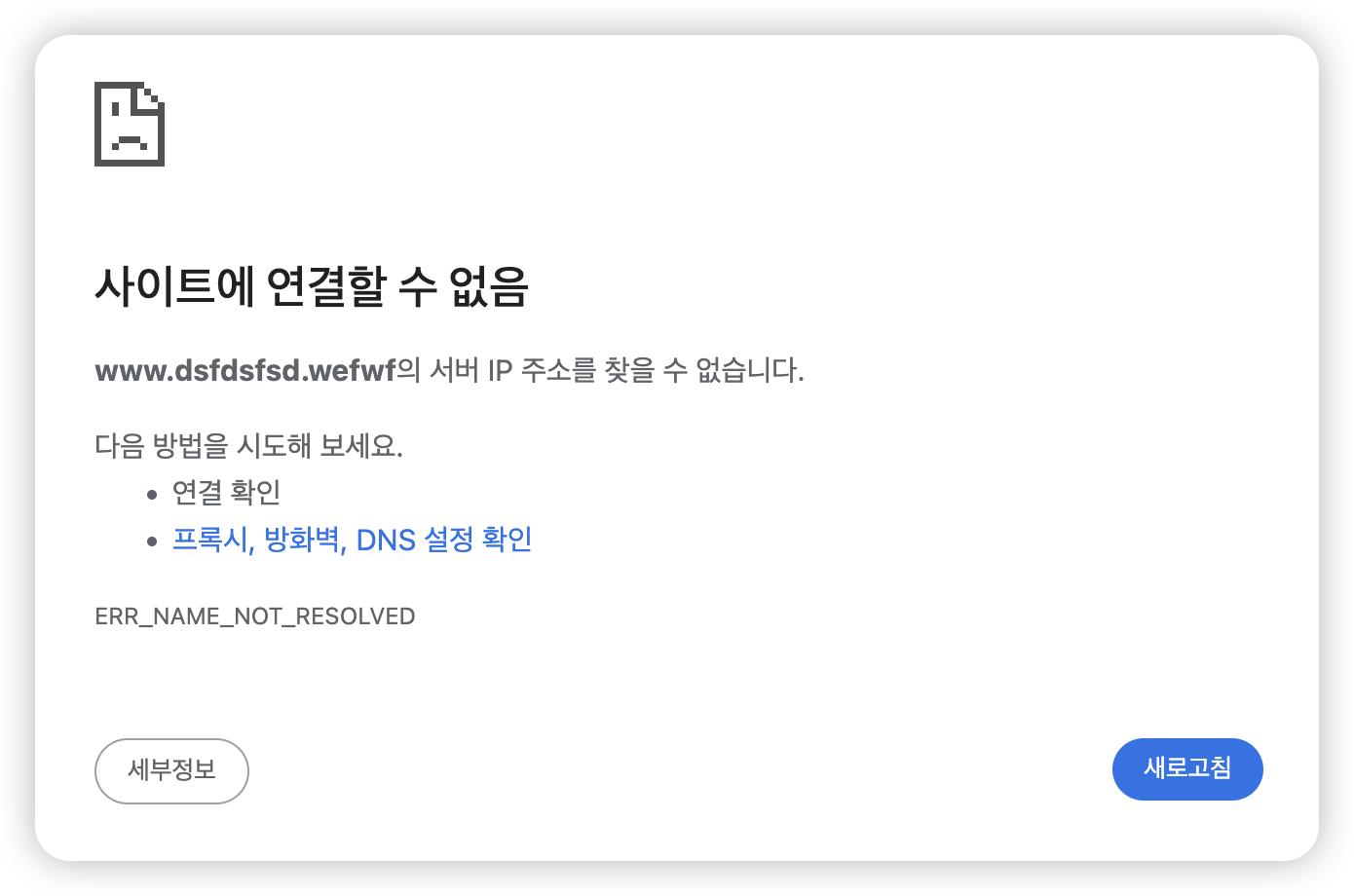 - ์ฐธ๊ณ : chrome://network-errors/์์ ๋ ์๋ฌ๋ฉ์ธ์ง ํ์ธ ๊ฐ๋ฅ